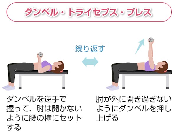 ダンベル・トライセプス・プレスは上腕三頭筋のなかでも特に外側頭と内側頭に効果があるトレーニングです。